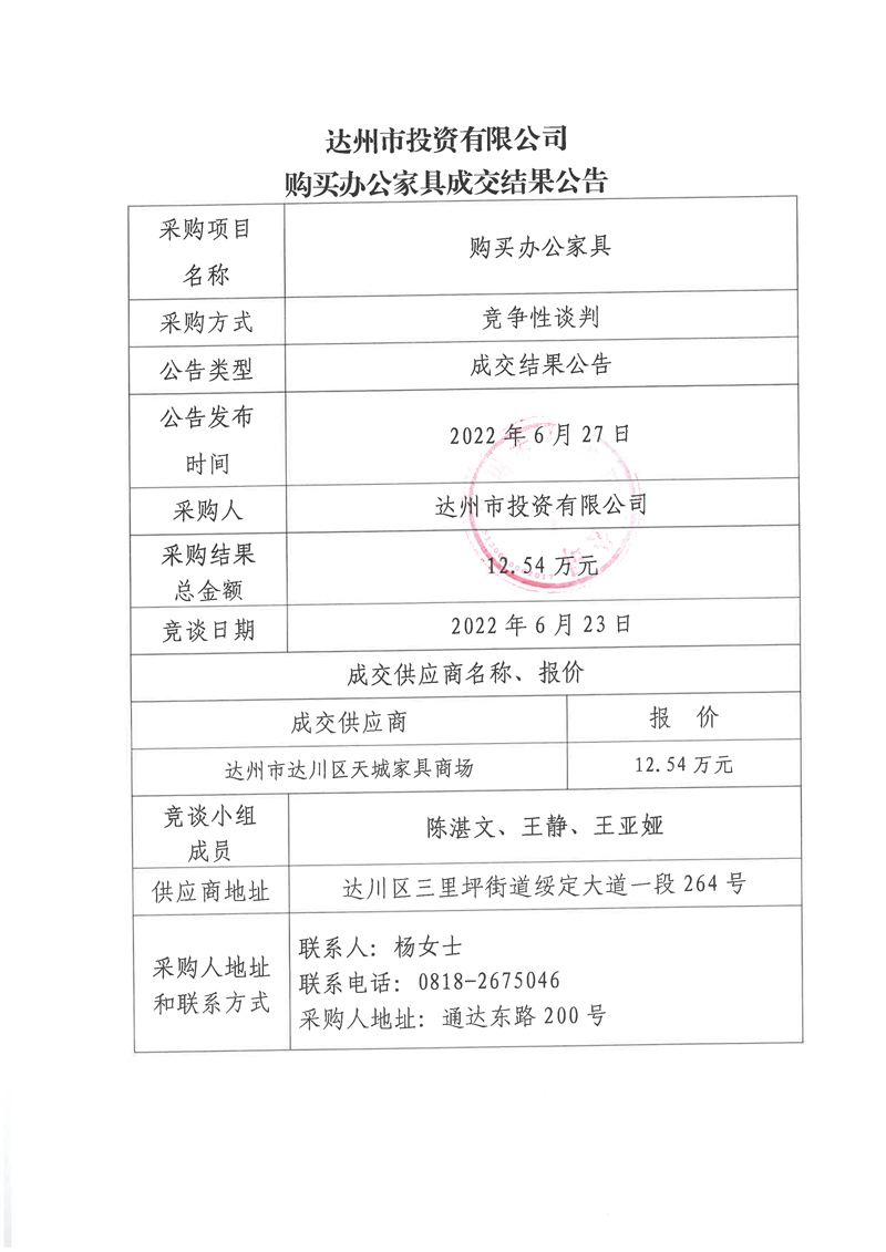 達(dá)州市投資有限公司購買辦公家具成交結(jié)果公告