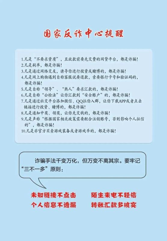為進(jìn)一步擴(kuò)大反詐宣傳覆蓋面,提高廣大群眾防騙意識,國家反詐中心制作了《防范電信網(wǎng)絡(luò)詐騙宣傳手冊》,向廣大人民群眾介紹了十種常見的電信網(wǎng)絡(luò)詐騙類型,揭批了詐騙犯罪手法、文末有防騙神器,同時進(jìn)行了防騙提示。